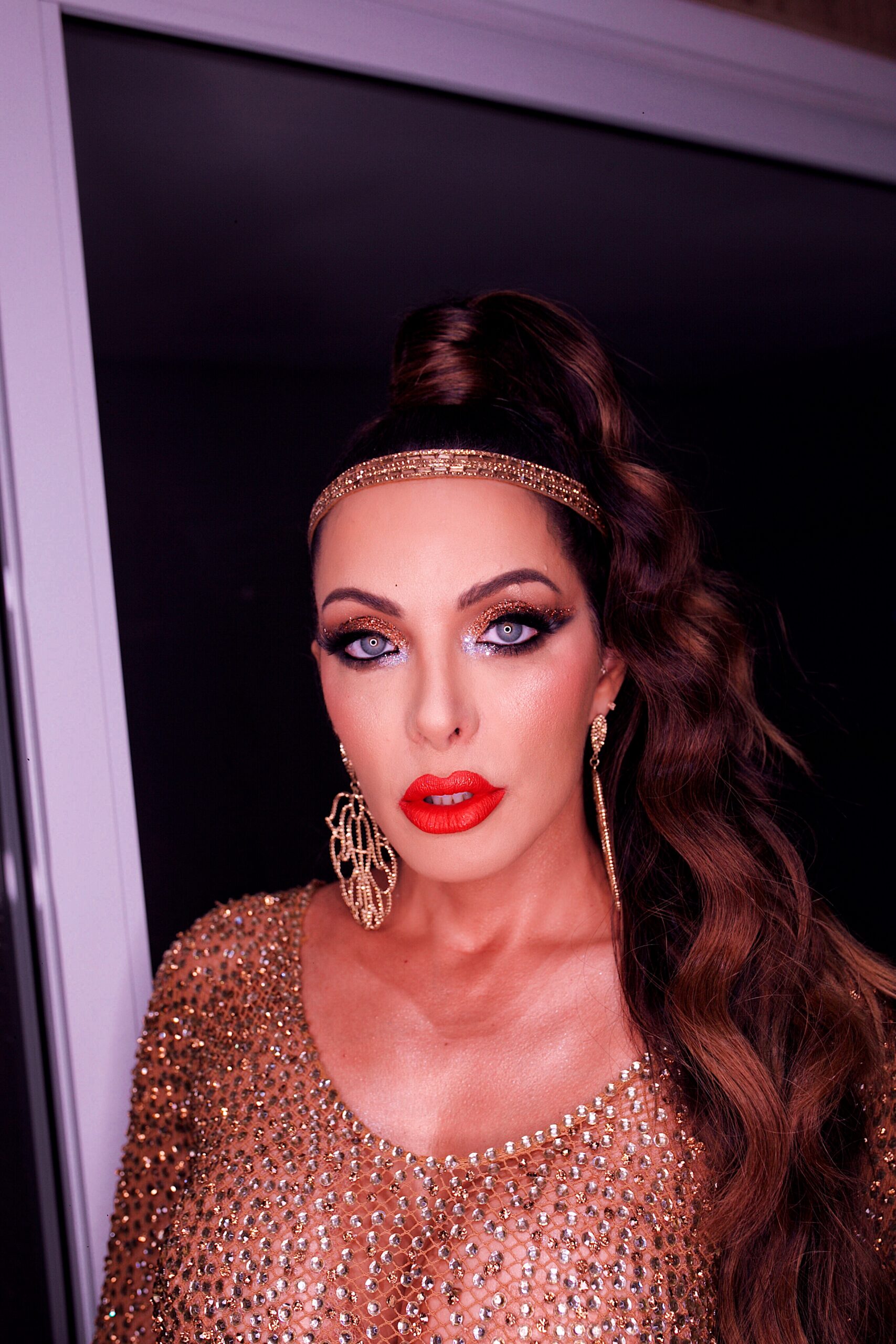 Para o mini desfile, a apresentadora escolheu um esplendoroso macacão arrastão cor da pele em látex trançado importado, cravejado em pedrarias e strass, com mais de 50 mil cristais na cor topázio. Para compor o look, headband e brincos combinando na cor.