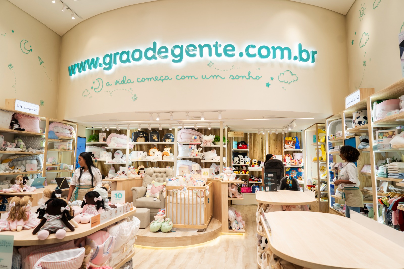 A Grão de Gente, que está há mais de uma década atuando e investindo constantemente no meio digital, passa a contar com sua primeira loja física, na cidade de Santos, no Praiamar Shopping. Com investimento de R$ 1,8 milhão para criação de sistemas para um ambiente totalmente imersivo de 86 m², no qual o consumidor terá acesso a óculos de realidade virtual, podendo visualizar e sentir como se estivesse em um quartinho do bebê; integração da loja física com o estoque da loja virtual; autoatendimento com pagamento por QR Code, pensado para o cliente que quer realizar a compra sozinho; e no fechamento da compra, a opção de finalização on-line, para os produtos que não estiverem disponíveis na loja física, com disponibilidade de entrega em casa, retirada na unidade ou no pick-up point; espaço com 100 m² instalado no estacionamento do shopping. Tudo para facilitar e proporcionar uma experiência de compra diferenciada.