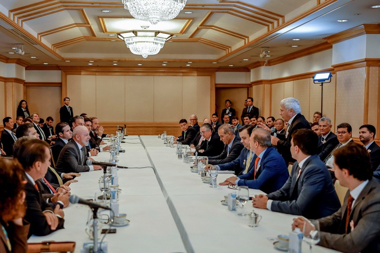 Após ser recebido oficialmente pelo Imperador Naruhito e pela Imperatriz Masako no Palácio Imperial, em Tóquio, o presidente Luiz Inácio Lula da Silva participou nesta terça-feira, 25 de março, de encontro com empresários brasileiros ligados à Associação Brasileira das Indústrias Exportadoras de Carne (ABIEC). Na pauta, a tentativa de abrir o mercado japonês ao setor. Ao final da reunião, acompanhada por parte significativa da comitiva brasileira, os ministros Carlos Fávaro (Agricultura e Pecuária), Renan Filho (Transportes) e Silvio Costa Filho (Portos e Aeroportos) falaram a jornalistas.