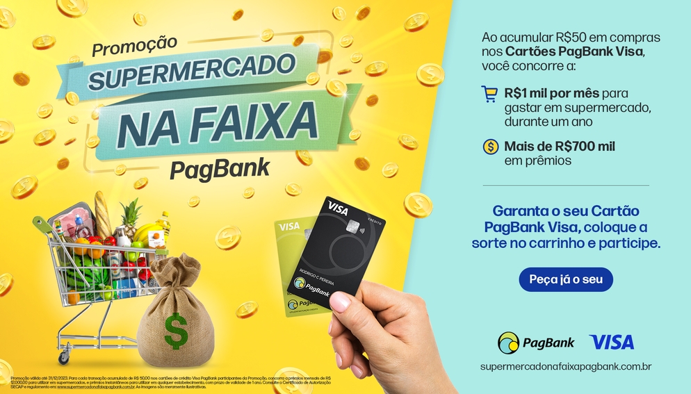 Os prêmios distribuídos são cartões pré-pagos, com função saque e transferência bloqueada, com sugestão de uso para a realização de compras em supermercados. Participe entre 02/08/2023 e 31/12/2023. Promoção para pessoa física maior de 18 anos e jurídica, titular do Cartão de Crédito PagBank Visa e/ou Cartão da Conta PagBank Visa que realizar o cadastro, manifestar o aceite ao regulamento e acumular R$ 50 em compras com o cartão PagBank Visa. Por favor, consulte os Regulamentos para mais informações. Certificados de Autorização SRE/MF nº 04.028637/2023 (Assemelhada a sorteio) e 05.028711/2023 (Assemelhada a vale-brinde).