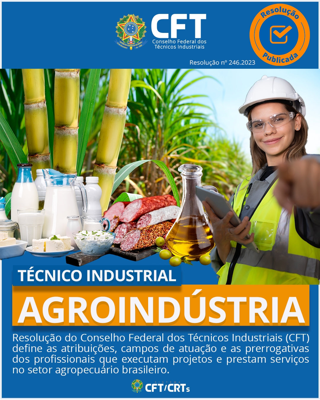 O Conselho Federal dos Técnicos Industriais (CFT) publicou a Resolução nº 246/2023 que define as atribuições, campos de atuação e as prerrogativas dos profissionais habilitados na modalidade de Agroindústria. A normativa federal aprovada na última sessão plenária de 2023 entrou em vigor no dia 21 de dezembro. Além de normatizar o exercício legal da profissão, o texto orienta os profissionais registrados no Sistema CFT/CRTs sobre a obrigatoriedade da emissão do Termo de Responsabilidade Técnica (TRT) na elaboração de estudos, execução de projetos e na prestação de serviços no setor agropecuário brasileiro.